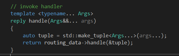 Deferred caller, delegator implementation with variadic template Recently I started playing with a small toy project – tiny web server with C++. The first requirement I wanted to implement was the 'static type routing handler' as shown from the crow project. Which means, users should be able to register its routing handlers as the following … Continue reading Deferred caller(or delegator.. whatever you name it) implementation with variadic template