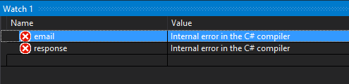 Moreover, if I tried to type specific variables into Watch window or immediate window, the debugger shows ‘Internal error in the C# compiler‘ error message!